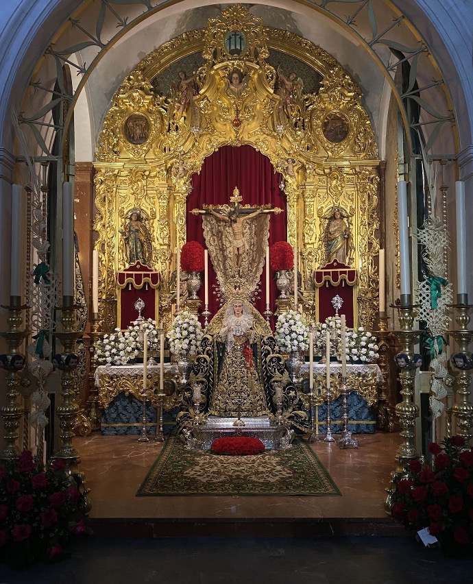 El retablo, situado en el muro del fondo, es de estilo barroco y fue construido en el siglo XVIII. En su hornacina central se sitúan nuestras sagradas imágenes titulares: el Santísimo Cristo de la Vera-Cruz y María Stma. de las Angustias Coronada. En una hornacina lateral se encuentra la figura de Santa María Magdalena, que acompaña a nuestro Santísimo Cristo en su paso procesional la tarde del Jueves Santo y Madrugada.