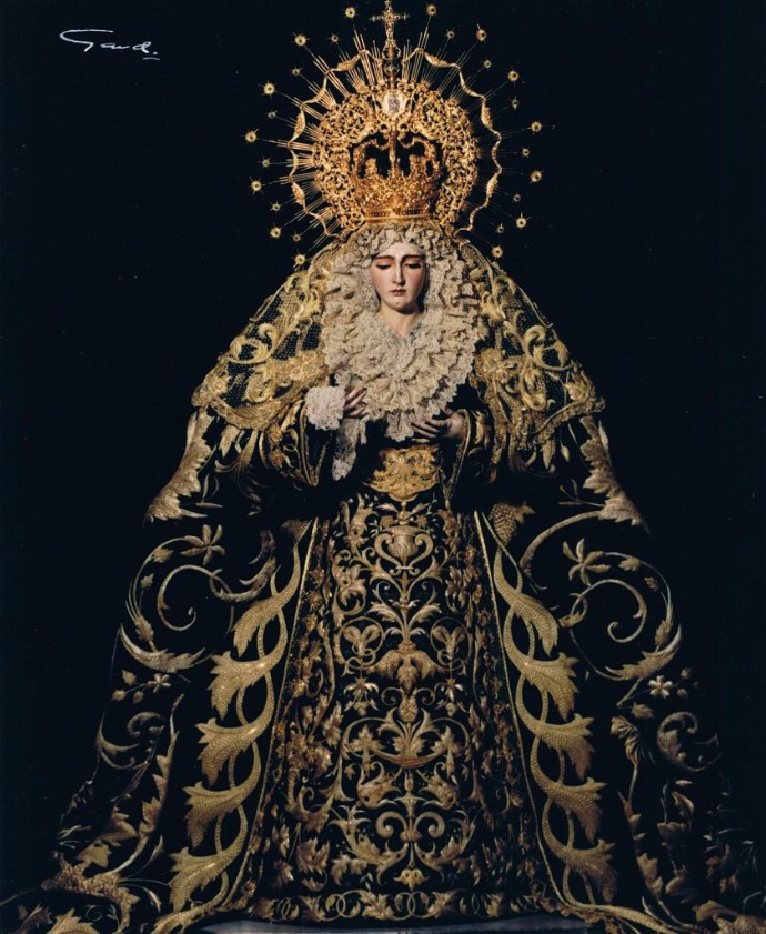 Así, para la celebración de la fiesta de la Virgen en su Pura e Inmaculada Concepción y la Natividad de Ntro. Señor, la Stma. Virgen viste con manto y saya bordados en oro sobre terciopelo azul celeste; mostrando en su rostro la presencia de la gracia santificante en una expresión cercana de joven madre, plena de virtudes y dones, concebida inmune al pecado. Este color no se introduce como expresión de la Liturgia hasta que su Santidad Pío IX le concede tal rango mediante la Bula "Ineffabilis Deus", del 8 de diciembre de 1854 en la que definió solemnemente el dogma de la Inmaculada Concepción de María con estas palabras: "Declaramos, pronunciamos y definimos que la doctrina que sostiene que la Santísima Virgen María, en el primer instante de su concepción, fue, por singular gracia y privilegio de Dios omnipotente, en previsión de los méritos de Cristo Jesús, Salvador del género humano, preservada inmune de toda mancha de culpa original, ha sido revelada por Dios y, por tanto, debe ser firme y constantemente creída por todos los fieles" (Dz. 1641).