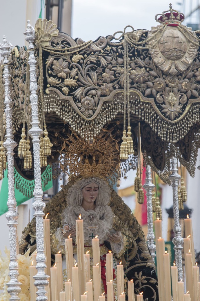 Vestida de Reina para la Salida Procesional del Jueves Santo, la solemnidad del verde oscuro de su manto decimonónico con excepcionales bordados del más puro estilo romántico y rica saya juanmanuelina hacen que su belleza sea sublime e impregnada de elevado clasicismo. Para acceder a la información sobre el paso de palio de Nuestra Señora, pulse aquí.