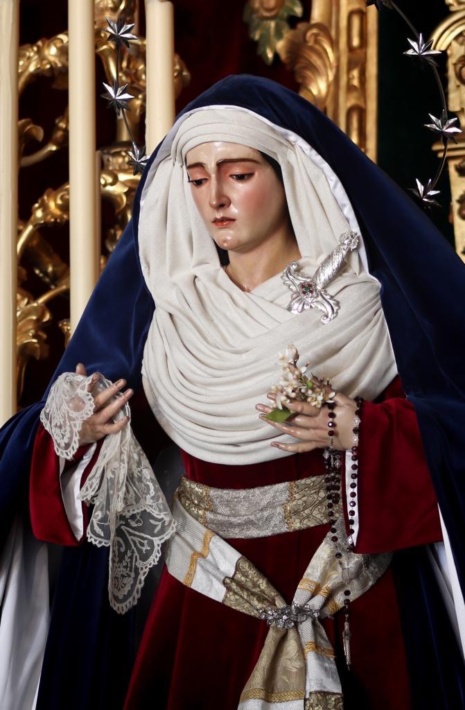 Para el periodo cuaresmal, la Virgen Santísima viste como mujer del pueblo hebreo, sin bordados ni aderezos; saya color jacinto, con cíngulo rayado de sedas y manto azul con vueltas blancas, recogido en la cintura, y sencillo aro dorado de estrellas circundando su cabeza. Con este atuendo, en el que cabe resaltar la perfección en las simetrías y pliegues de su tocado, y la singularidad de la diversidad cromática de los tejidos, la luz de su mirada intensifica la espera al pie de la cruz.
