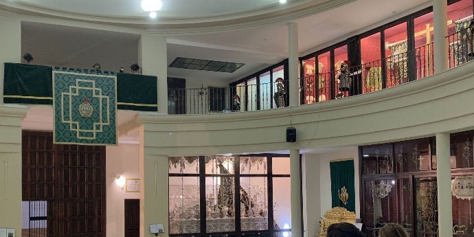Junto a las pertenencias del Stmo. Cristo, sobresale igualmente, en esta primera planta del Museo, el ajuar de María Stma. de las Angustias Coronada; de incalculable riqueza y proporcional a la veneración de sus hijos que, a lo largo de los siglos, le han ofrecido estas dádivas como signo de devoción. De entre los muchos atuendos de la Stma. Virgen que se muestran en esta exposición, podríamos destacar las dos sayas que la Madre de Dios ha lucido habitualmente en las procesiones de Jueves Santo: la más antigua, actualmente sobre terciopelo burdeos y anteriormente bordada sobre terciopelo negro, la lució María Stma. de las Angustias hasta 1909, fecha en la que se confeccionó la actual, bordada en terciopelo verde por el taller de Juan Manuel Rodríguez Ojeda. Junto a la destacada colección de sayas y mantos de camarín, se exponen, igualmente, varias aureolas y preseas de la Sagrada Imagen; especialmente destacada es la corona de imperiales del segundo tercio del s. XVIII; así como varios cíngulos y tocas de sobremanto, además de la primitiva enagua de la Stma. Virgen, custodiada a través de los siglos por sus camareras y ahora expuesta en el Museo.